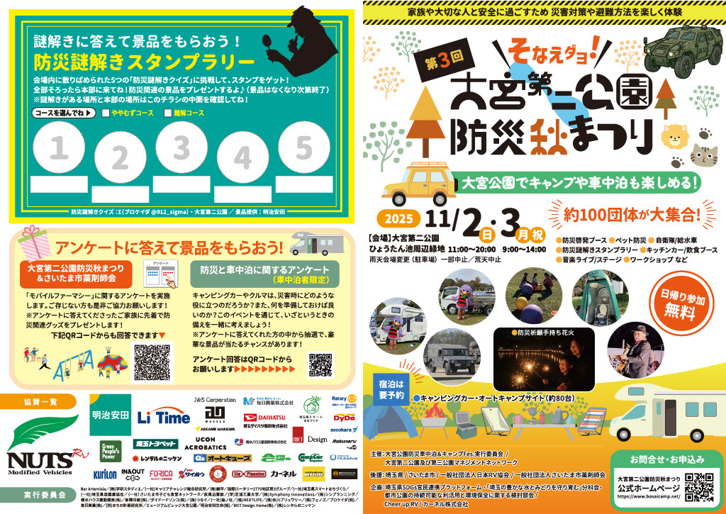 2025年11月2日(日)・3日(祝)の2日間、秋晴れの大宮第二公園にて第三回目の開催となった「大宮第二公園防災秋まつり(大宮公園防災車中泊&キャンプFes.)」。今回の来場者は15,000名を超え、会場は大いに賑わっておりました。