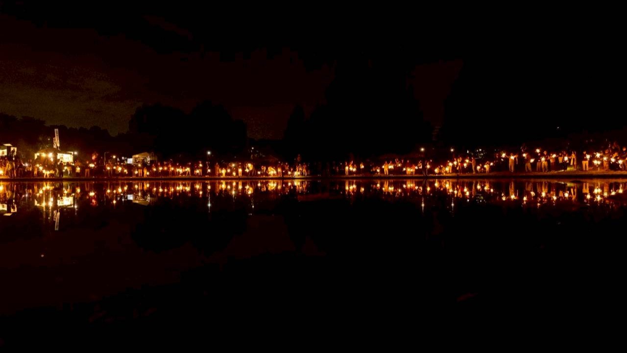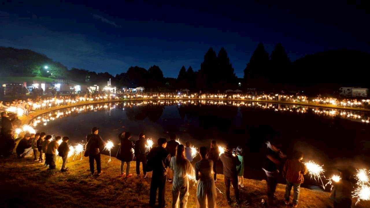 初日のフィナーレは、ひょうたん池をぐるりと囲んでの「防災祈願 手持ち花火」。美しい夕焼け空が星空に変わる頃、参加者が一体となる幻想的な光景が現われました。